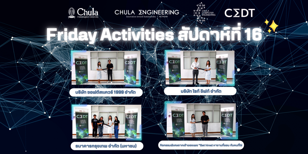 ข่าวสาร ?️?️ ประมวลภาพงานกิจกรรม Friday Activities (สัปดาห์ที่ 16) Tweet April 28, 2025 กิจกรรมนิสิต, ปริญญาตรี Tag: CEDT, CP, CPCU, CUCA, Friday Activities, วิศวะคอมจุฬา ?️?️ ประมวลภาพงานกิจกรรม Friday Activities (สัปดาห์ที่ 16) ?️?️ ? เมื่อ วัน ศุกร์ ที่ 25 เมษายน 2568 ? ? บริษัท ซอฟต์สแควร์ 1999 จำกัด ? นิสิตได้รับฟังประสบการณ์จากกิจกรรม IOIC TALK ซึ่งเป็นการแบ่งปันเรื่องราวการทำงานของรุ่นพี่ที่ประสบความสำเร็จ นิสิตได้เรียนรู้ทักษะต่างๆ ที่จำเป็นในการทำงาน รวมถึงเคล็ดลับที่จะช่วยให้นิสิตประสบความสำเร็จในอนาคต ? บริษัท ไรท์ ชิฟท์ จำกัด ? ในสัปดาห์นี้ นิสิตได้เรียนรู้เกี่ยวกับจุดเริ่มต้นของเทคโนโลยี bitcoin พร้อมกับได้รับฟังประวัติศาสตร์การเงิน เพื่อทำความเข้าใจกระบวนการสร้างเงินเฟ้อและผลกระทบต่อชีวิตของนิสิต ? กิจกรรมพิเศษจากเจ้าของเพจ Get hired ? นิสิตได้เรียนรู้วิธีการเขียน Resume ที่โดดเด่นและน่าสนใจ ซึ่งเป็นสิ่งสำคัญในการดึงดูดความสนใจของผู้ว่าจ้าง นอกจากนี้ยังได้รับคำแนะนำเกี่ยวกับการเตรียมตัวและการตอบคำถามในการสัมภาษณ์งาน เพื่อเสริมสร้างความมั่นใจให้นิสิตในการเผชิญกับกระบวนการสมัครงานและการสัมภาษณ์งาน ? ธนาคารกรุงเทพ จำกัด (มหาชน) ? นิสิตได้เรียนรู้เกี่ยวกับ Career Counseling และร่วมเล่นเกมส์ท้าทายศักยภาพของ TECH People ร่วมกับทีมพี่ๆ HR จาก BBL เพื่อเตรียมความพร้อมและเพิ่มศักยภาพให้กับนิสิต กิจกรรมนี้ช่วยเพิ่มโอกาสในการเรียนรู้การทำงานจริงกับองค์กรการเงินชั้นนำระดับอาเซียน เรียนรู้การวางแผนและพัฒนาทักษะที่จำเป็นในการทำงานในยุคดิจิทัล รวมถึงการปรับตัวในสภาพแวดล้อมการทำงานที่เปลี่ยนแปลงอยู่เสมอ ข่าว Pages -TCAS1: Portfolio CP -TCAS3: Admission CP MOU ความร่วมมือกับหลักสูตร CEDT Search Results TABEE 2561 – 2563 TABEE 2564 – 2569 TCAS1 : Portfolio CEDT TCAS2 : Quota CEDT TCAS3 : Admission CEDT ขั้นตอนการเขียนคำร้องของนิสิต ระดับบัณฑิตศึกษา ดาวน์โหลดเอกสารระดับบัณฑิตศึกษา ดาวน์โหลดแบบฟอร์มสำหรับนิสิต ติดต่อเรา ทุนการศึกษาจากบัณฑิตวิทยาลัยและภาควิชาวิศวกรรมคอมพิวเตอร์ นิสิตปัจจุบัน FaceRecognition Register System FAQ บัณฑิตศึกษา บัณฑิตศึกษา ป.เอก CD หลักสูตรเดิม พ.ศ.2558 ป.เอก วิศวกรรมคอมพิวเตอร์ (CD) ป.โท CM หลักสูตรเดิม พ.ศ.2561 ป.โท CS หลักสูตรเดิม พ.ศ.2561 ป.โท SE หลักสูตรเดิม พ.ศ.2561 ป.โท วิทยาศาสตร์คอมพิวเตอร์ (CS) ป.โท วิศวกรรมคอมพิวเตอร์ (CM) ป.โท วิศวกรรมซอฟต์แวร์ (SE) ประกาศ/ระเบียบ/ข้อบังคับ บัณฑิตศึกษา เอกสารเกี่ยวกับวิทยานิพนธ์ ปริญญาตรี ดาวน์โหลดเอกสารทุนการศึกษาและแบบฟอร์มต่างๆระดับปริญญาตรี ฝึกงาน – หางาน ป.ตรี วิศวกรรมคอมพิวเตอร์และเทคโนโลยีดิจิทัล ผลงานของเรา ผู้สนใจ ตำรา บรรยากาศภาควิชา ป.ตรี CP หลักสูตร พ.ศ.2559 ป.ตรี CP หลักสูตร พ.ศ.2561 ป.ตรี วิศว