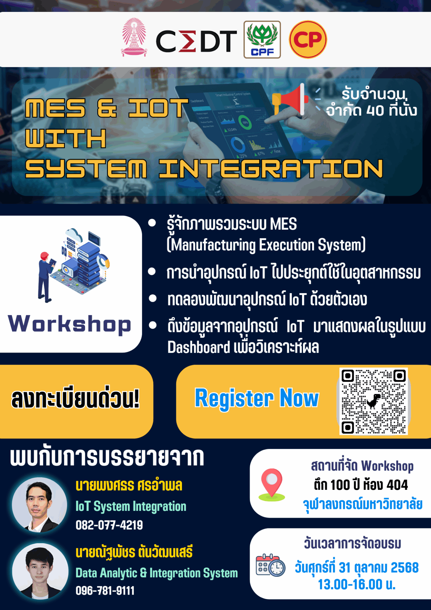 นิสิตจะได้เรียนรู้ในเรื่องของาพรวมระบบ MES (Manufacturing Execution System) และการนำอุปกรณ์ IoT ไปประยุกต์ใช้ในอุตสาหกรรม อีกทั้งทดลองพัฒนาอุปกรณ์ IoT ด้วยตัวเอง รวมไปถึงดึงข้อมูลจากอุปกรณ์ IoT มาแสดงผลในรูปแบบ Dashboard เพื่อวิเคราะห์ผล