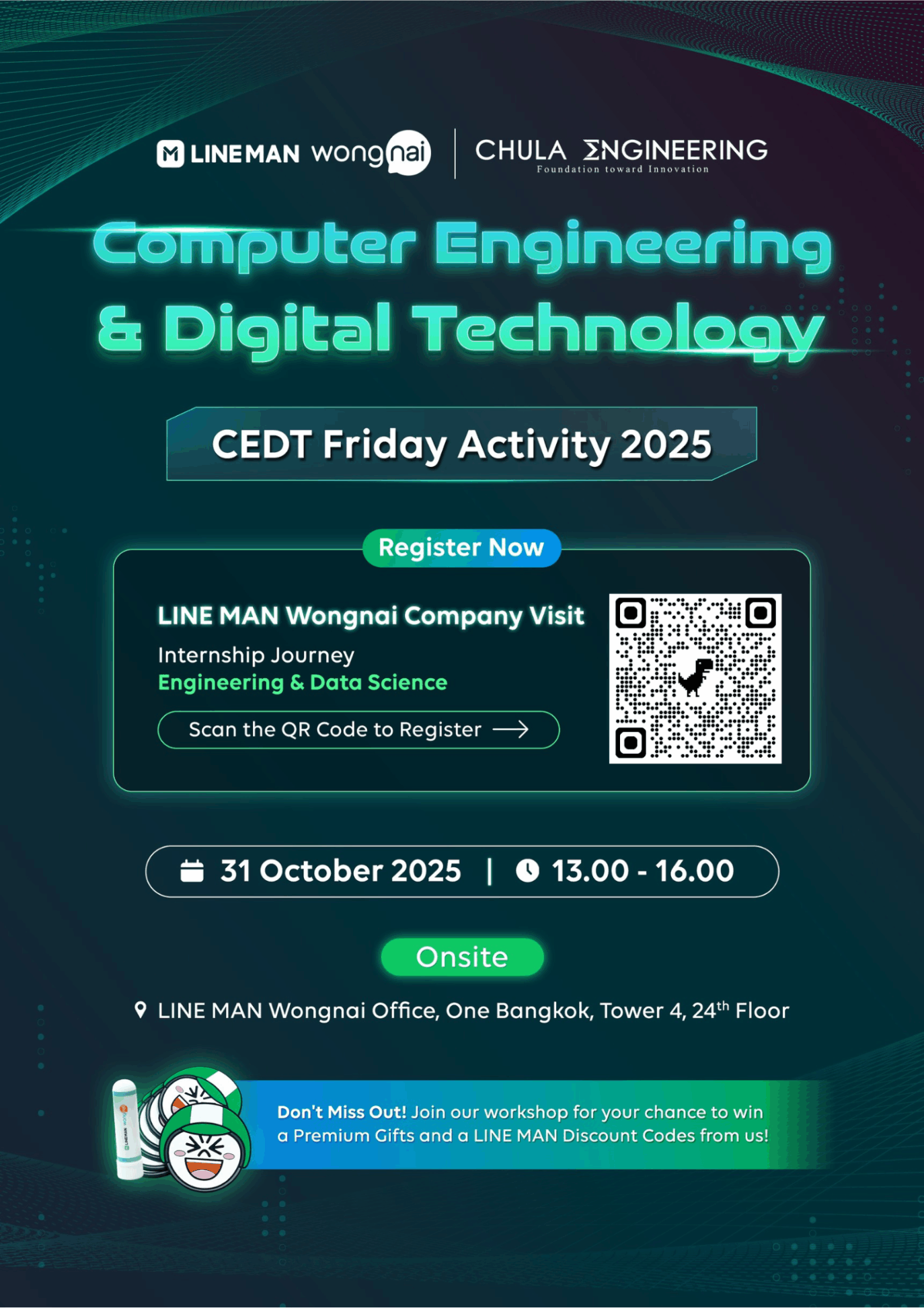 นิสิตจะได้มีโอกาสเข้าเยี่ยมชมบริษัท ไลน์แมน วงใน จำกัด พร้อมสัมผัสบรรยากาศการทำงานจริงของทีมงานภายในองค์กรอย่างใกล้ชิด อีกทั้งยังได้เข้าร่วมกิจกรรมเวิร์กช็อปสุดพิเศษจากทีม Engineering & Data Science ซึ่งออกแบบมาเพื่อเสริมสร้างประสบการณ์และเติมเต็มองค์ความรู้ในสายงานเทคโนโลยีอย่างเข้มข้น ถือเป็นโอกาสอันดีในการเรียนรู้จากผู้เชี่ยวชาญตัวจริงและเปิดมุมมองใหม่สู่โลกการทำงานในอนาคต