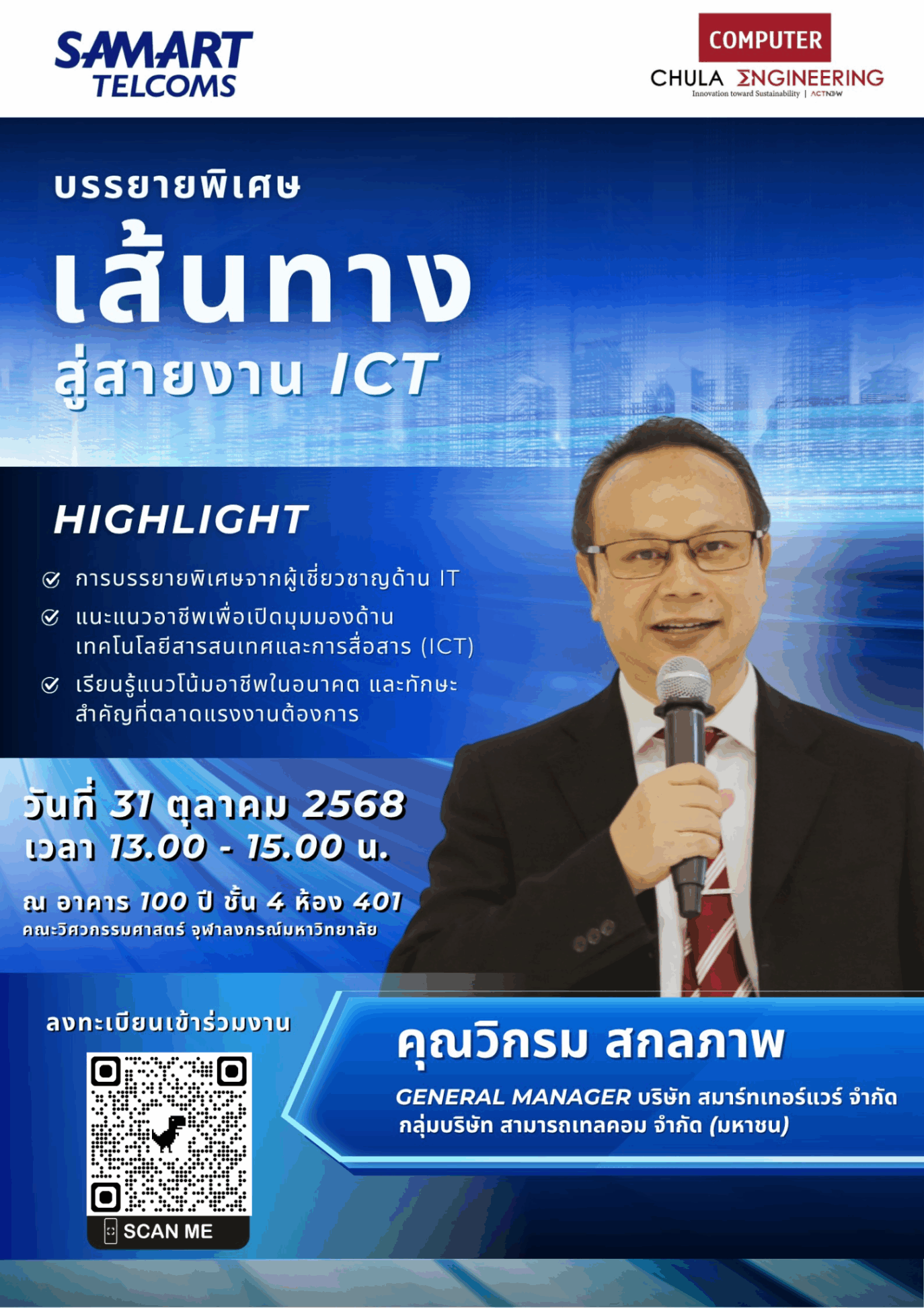 ในสัปดาห์นี้ ภาควิชาวิศวกรรมคอมพิวเตอร์ขอเชิญชวนนิสิตเข้าร่วมกิจกรรมการเรียนรู้จากประสบการณ์จริงของสถานประกอบการชั้นนำ ผ่านหัวข้อที่น่าสนใจและหลากหลาย เช่น Design Thinking Framework เยี่ยมชมสถานประกอบการที่บริษัท ไลน์แมน วงใน จำกัด การเตรียมความพร้อมสู่เส้นทางอาชีพในอนาคตด้วยเคล็ดลับพิเศษ ภาพรวมระบบ MES (Manufacturing Execution System) การแนะนำสถานประกอบการ และเส้นทางอาชีพ การนำ AI เข้ามาช่วยในการทำงาน