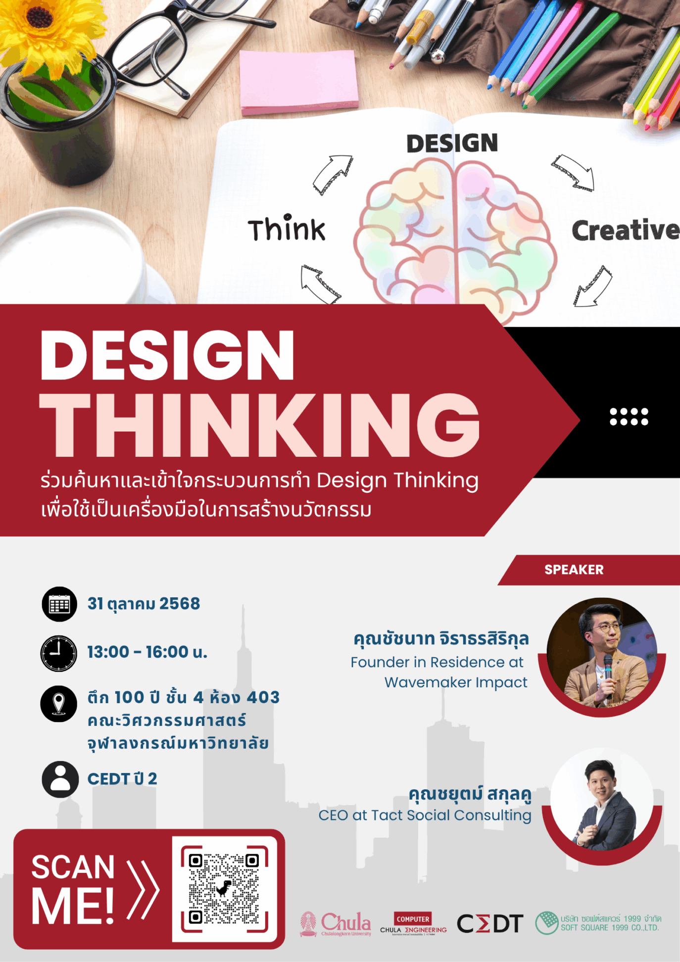 ในสัปดาห์นี้นิสิตจะได้เรียนรู้แนวคิดและกระบวนการของ Design Thinking Framework ผ่านกิจกรรม Design Thinking ที่ออกแบบมาเพื่อเสริมสร้างทักษะการคิดเชิงออกแบบและการสร้างนวัตกรรมใหม่ ๆ ร่วมกันในการพัฒนาโครงการซอฟต์แวร์ โดยกิจกรรมนี้จะช่วยให้นิสิตเข้าใจขั้นตอนของ Design Thinking อย่างเป็นระบบและสามารถนำไปประยุกต์ใช้เป็นเครื่องมือสำคัญในการต่อยอดไอเดียและพัฒนาโซลูชันที่ตอบโจทย์ความต้องการของผู้ใช้ได้อย่างสร้างสรรค์