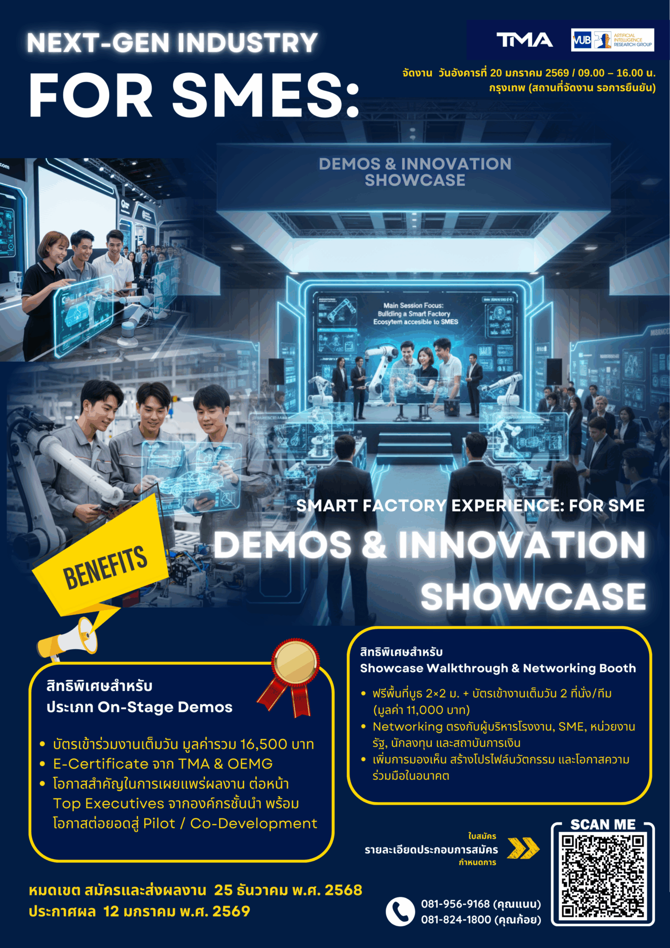 TMA ร่วมกับ VUB Artificial Intelligence Research Group ขอเชิญผู้ประกอบการ SME และผู้สนใจด้านอุตสาหกรรมยุคใหม่ เข้าร่วมงาน NEXT-GEN INDUSTRY FOR SMEs: DEMOS & INNOVATION SHOWCASE สัมผัสประสบการณ์ “Smart Factory for SMEs” ผ่านการสาธิตเทคโนโลยีจริงและนวัตกรรมล่าสุด เพื่อยกระดับธุรกิจไทยสู่โรงงานอัจฉริยะ