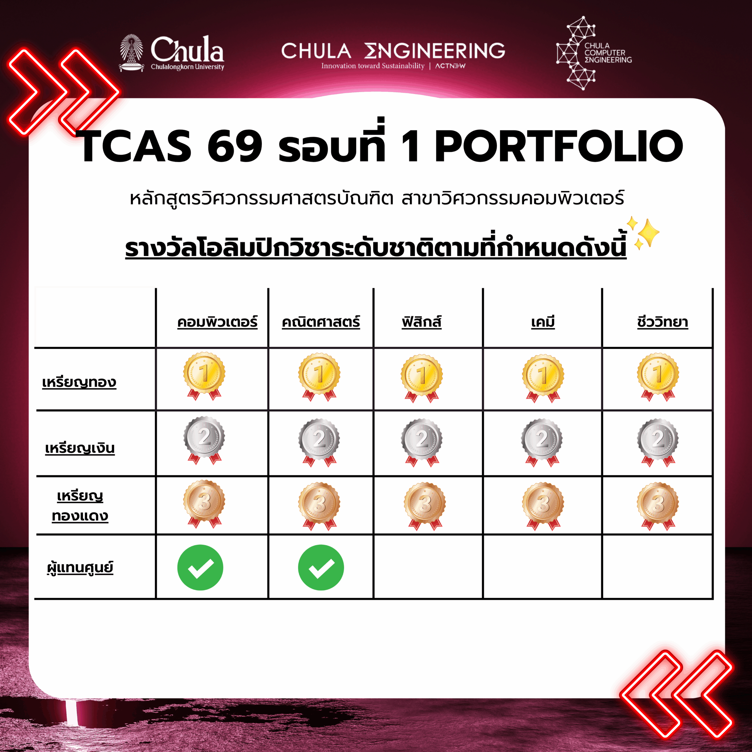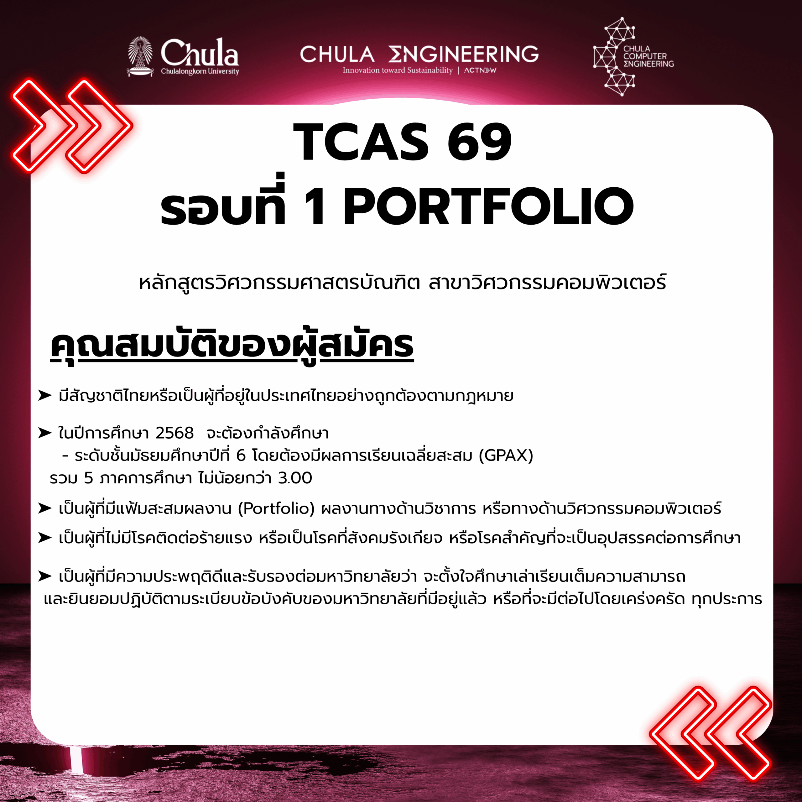 TCAS1: Portfolio CP Tweet ประกาศรับสมัครหลักสูตรวิศวกรรมศาสตรบัณฑิต สาขาวิศวกรรมคอมพิวเตอร์ (TCAS1 CP) ปีการศึกษา 2569 อ่านรายละเอียดประกาศรับสมัคร TCAS1 ปีการศึกษา 2569 ได้ที่นี่ >>>> กดคลิ๊กดาวน์โหลด รับสมัครผ่านระบบ TCAS >>>>>> https://admission.chula.ac.th/admission_c1.php TCAS1: Portfolio CP Pages cp.eng.chula.ac.th MOU ความร่วมมือกับหลักสูตร CEDT Search Results TABEE 2561 – 2563 TABEE 2564 – 2569 TCAS1: Portfolio CEDT TCAS1: Portfolio CP TCAS2: Quota TCAS3: Admission CEDT TCAS3: Admission CP ขั้นตอนการเขียนคำร้องของนิสิต ระดับบัณฑิตศึกษา งานเฉลิมฉลองครบรอบ 50 ปี ภาควิชาวิศวกรรมคอมพิวเตอร์ ดาวน์โหลดเอกสารระดับบัณฑิตศึกษา ดาวน์โหลดแบบฟอร์มสำหรับนิสิต ติดต่อเรา ทุนการศึกษาจากบัณฑิตวิทยาลัยและภาควิชาวิศวกรรมคอมพิวเตอร์ นิสิตปัจจุบัน FaceRecognition Register System FAQ บัณฑิตศึกษา บัณฑิตศึกษา ป.เอก CD หลักสูตรเดิม พ.ศ.2558 ป.เอก วิศวกรรมคอมพิวเตอร์ (CD) ป.โท CM หลักสูตรเดิม พ.ศ.2561 ป.โท CS หลักสูตรเดิม พ.ศ.2561 ป.โท SE หลักสูตรเดิม พ.ศ.2561 ป.โท วิทยาศาสตร์คอมพิวเตอร์ (CS) ป.โท วิศวกรรมคอมพิวเตอร์ (CM) ป.โท วิศวกรรมซอฟต์แวร์ (SE) ประกาศ/ระเบียบ/ข้อบังคับ บัณฑิตศึกษา เอกสารเกี่ยวกับวิทยานิพนธ์ ปริญญาตรี ดาวน์โหลดเอกสารทุนการศึกษาและแบบฟอร์มต่างๆระดับปริญญาตรี ฝึกงาน – หางาน ป.ตรี วิศวกรรมคอมพิวเตอร์และเทคโนโลยีดิจิทัล ผลงานของเรา ผู้สนใจ ตำรา บรรยากาศภาควิชา ป.ตรี CP หลักสูตร พ.ศ.2559 ป.ตรี CP หลักสูตร พ.ศ.2561 ป.ตรี วิศวกรรมคอมพิวเตอร์ (CP) รู้จักวิศวกรรมคอมพิวเตอร์ สำหรับผู้สมัครหลักสูตร วศ.ด. และ วศ.ม. วิศวกรรมคอมพิวเตอร์ – ดาวน์โหลดเอกสารการเลือกหัวข้อวิจัย ระบบคำร้องของนิสิตงานทะเบียนและประเมินผล คณะวิศวกรรมศาสตร์ จุฬาฯ วิจัย / บริการวิชาการ ห้องปฏิบัติการวิจัย โครงการวิจัย สำหรับผู้สมัครหลักสูตร วท.ม. วิทยาศาสตร์คอมพิวเตอร์ (CS) – ดาวน์โหลดแบบฟอร์มประกอบการสมัครหลักสูตร CS สำหรับผู้สมัครหลักสูตร วท.ม. วิศวกรรมซอฟต์แวร์ (SE) – ดาวน์โหลดแบบฟอร์มประกอบการสมัครหลักสูตร SE หน้าแรก เกี่ยวกับเรา คณะผู้บริหาร คณาจารย์ กมลลักษณ์ สุขเสน กุลธิดา โรจน์วิบูลย์ชัย กุลวดี ศรีพานิชกุลชัย ญาใจ ลิ่มปิยะกรณ์ ณรงค์เดช กีรติพรานนท์ ณัฐพงศ์ ชินธเนศ ณัฐวุฒิ หนูไพโรจน์ ณัท ภวสัน ดวงดาว วิชาดากุล ทวิตีย์ เสนีวงศ์ ณ อยุธยา ธงชัย โรจน์กังสดาล ธนารัตน์ ชลิดาพงศ์ ธาราทิพย์ สุวรรณศาสตร์ นครทิพย์ พร้อมพูล นัทที นิภานันท์ บุญเสริม กิจศิริกุล ประภาส จงสถิตย์วัฒนา พรรณราย ศิริเจริญ พิชญะ สิทธีอมร พิตติพล คันธวัฒน์ พิษณุ คนองชัยยศ พีรพล เวทีกูล มัชฌิกา อ่องแตง วริษา ศรีไตรรัตนรักษ์ วิวัฒน์ วัฒนาวุฒิ วิษณุ โคตรจรัส วีระ เหมืองสิน สมชาย ประสิทธิ์จูตระกูล สุกรี สินธุภิญโญ สุขุม สัตตรัตนามัย สุธี เรืองวิเศษ อ