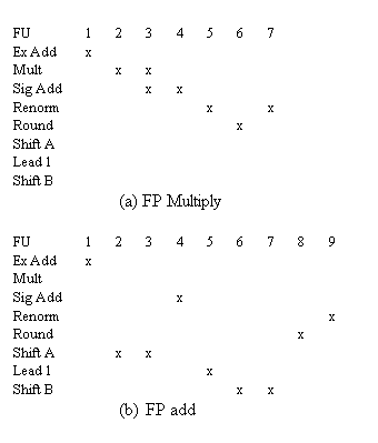 A reservation table shows a timing diagram of a flow of data through the functional unit. The reservation table is derived directly from the pipeline design. It is used to decide when to launch an operation into the pipeline. Both operations cannot use the same unit at the same time. A collision vector represents the collision information. Position i contains a bit that indicates whether or not a new operation can be launched i units after the first operation has been started.