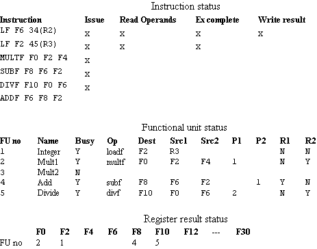 1. Instruction statusAssuming the execution of the floating-point functional units are : add is 2 clocks, multiply is 10 clocks and divide is 40 clocks. Each instruction that has issued, has an entry in the instruction status table. Once the instruction issues, the record of its operands is kept in the functional unit status table. See the figure, the instruction status says that